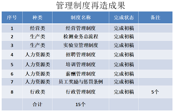 麦森顿管理咨询按照经营目标、组织设计与人力资源之间相互作用关系,对企业运营架构进行梳理,上层架构梳理企业愿景与文化、企业战略与组织、管理平台,中层架构梳理生产管理、营销管理、人力资源管理、技术研发管理、财务管理,底层架构梳理个人效能,在充分调研与诊断基础上,进行管理体系优化再造,第一批再造管理制度15个,第二批再造管理制度5个。