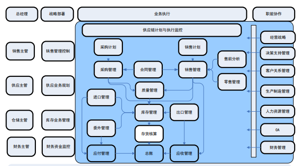 包括合同管理、售前分析、销售管理、出口管理、采购管理、委外管理、库存 管理、存货核算、质量管理、GSP、WEB 业务和进口管理。供应链管理可进一步加深制造领域和行业领域的应用,优化供应链业务流程,并加强与制造、零售、分销等业务的整 合。整体流程如下所示: