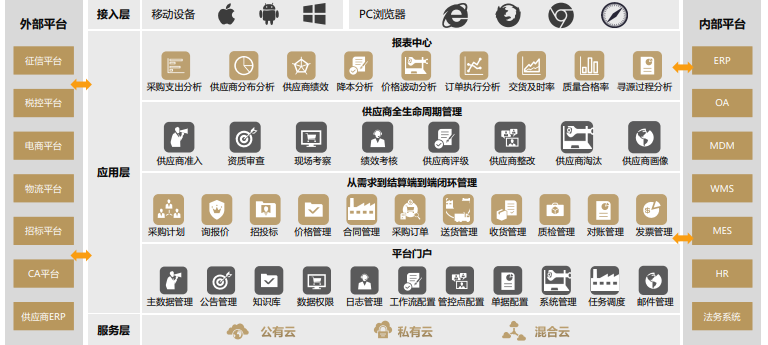 SCM/SRM系统可改善供应链上下游关系,规范企业采购流程,提高采购效率,进行供需双方资源协作、优势互补,包括采购寻源、采购分析、供应商管理、协同采购、财务对账等功能。