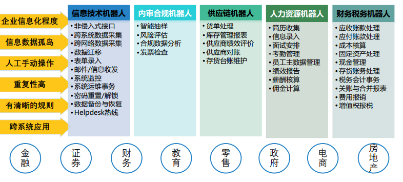 RPA是一种技术应用,由业务逻辑和结构化 输入管理,旨在实现业务流程的自动化。使 用RPA工具,公司可以配置软件或用“机器 人”来掌控和干预应用程序,用于处理事务, 处理数据,触发响应和与其他数字系统通信。 RPA场景的范围很简单,例如生成自动响应, 电子邮件,部署数千个机器人,每个机器人 都可以在ERP系统中自动化作业 。