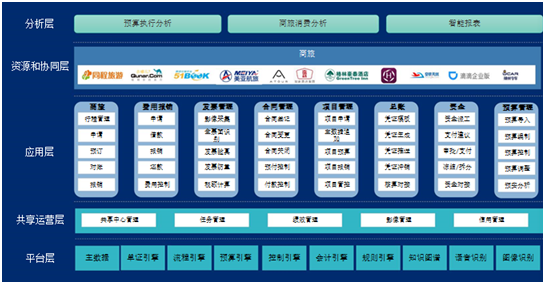 费控系统按照平台层、共享运营层、应用层、资源协同层、分析层设置功能如下: