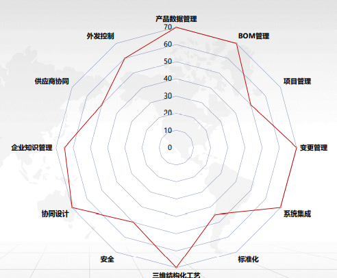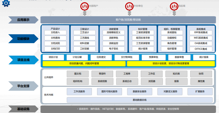 产品生命周期管理系统包括图文档管理、变更管理、编码管理、轻量化浏览器、BOM管理、知识管理、项目管理、工作流管理、系统集成。