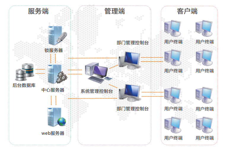 数据防扩散系统旨在对企业中重要的产品设计及文档数据提供有效的保护,在技术上采用先进的 加密算法对指定的文件数据进行加密,密钥及核心算法存放于硬件智能卡内,不可跟踪及复制。加密后的文件在企 业内部可以正常使用,在企业外部则由于不能获得文件的密钥,无法解析文件的加密数据,从而达到对重要数据进 行保护的目的。