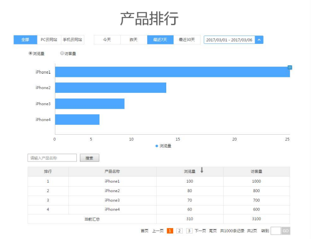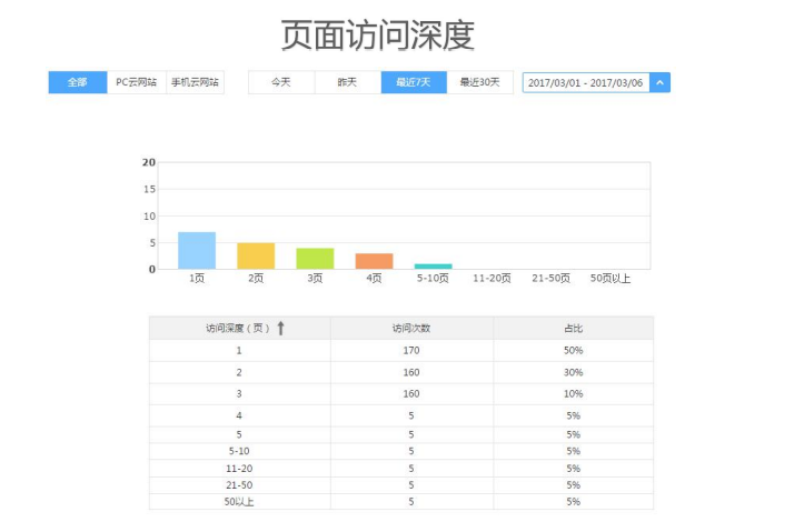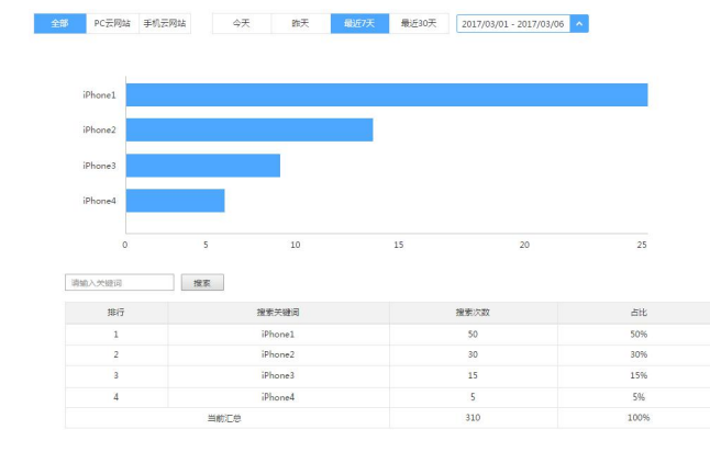 在百度流量统计基础上,增加了访客停留时间、页面访问深度、产品排行、产品类别排行、站内搜索关键词的统计分析,所有统计数据都根据PC云网站和手机云网站进行区分。