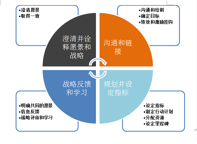 (五)将企业战略转化为行动,使战略有效执行;针对战略执行状况进行绩效考核,激励各级人员完成战略任务;将企业发展与员工发展紧密相连,设计有效奖励体系吸引人才、留住人才。